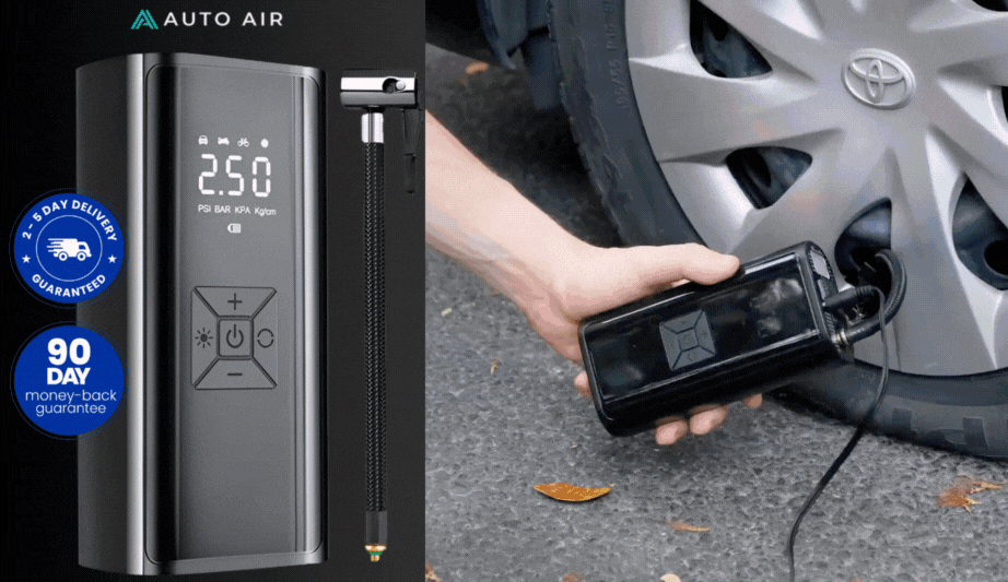 Auto Air delivers a powerful inflation pressure of 150 PSI with one-touch presets and interchangeable adapter tips, making it the ultimate tool for road trips, biking, camping, and more! With it, you'll never need a tow truck or a gas station again, ensuring you keep moving with your new essential companion.